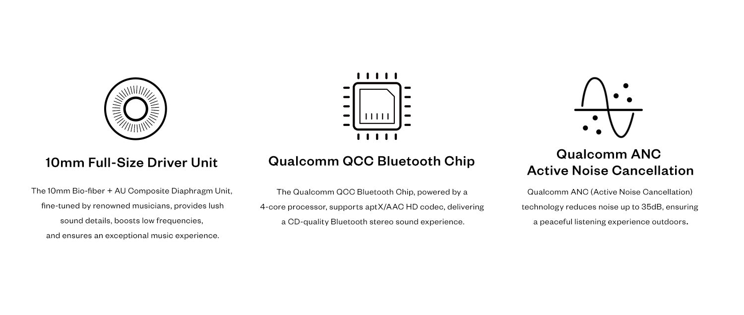 - HD sound with Qualcomm chip and aptX/AAC codec for immersive audio.